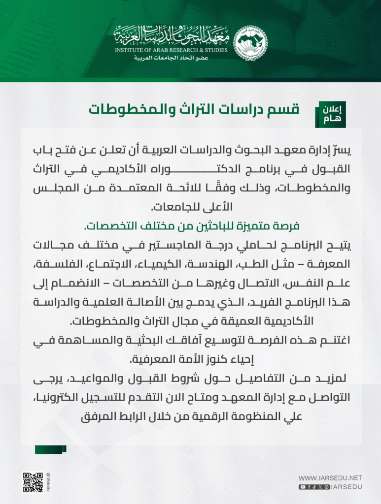 يسرّ إدارة معهد البحوث والدراسات العربية أن تعلن عن فتح باب القبول في برنامج الدكتوراه الأكاديمي في التراث والمخطوطات، وذلك وفقًا للائحة المعتمدة من المجلس الأعلى للجامعات.