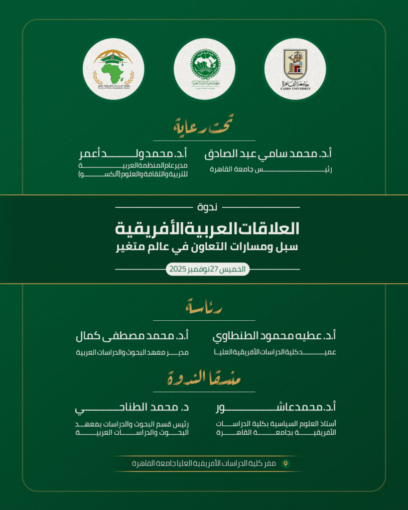 ينظم معهد البحوث والدراسات العربية بالمشاركة مع كلية الدراسات الأفريقية العليا – جامعة القاهرة ندوة (العلاقات العربية الأفريقية: سُبل ومسارات التعاون في عالم متغيّر)، وذلك يوم الخميس الموافق 27 نوفمبر 2025.